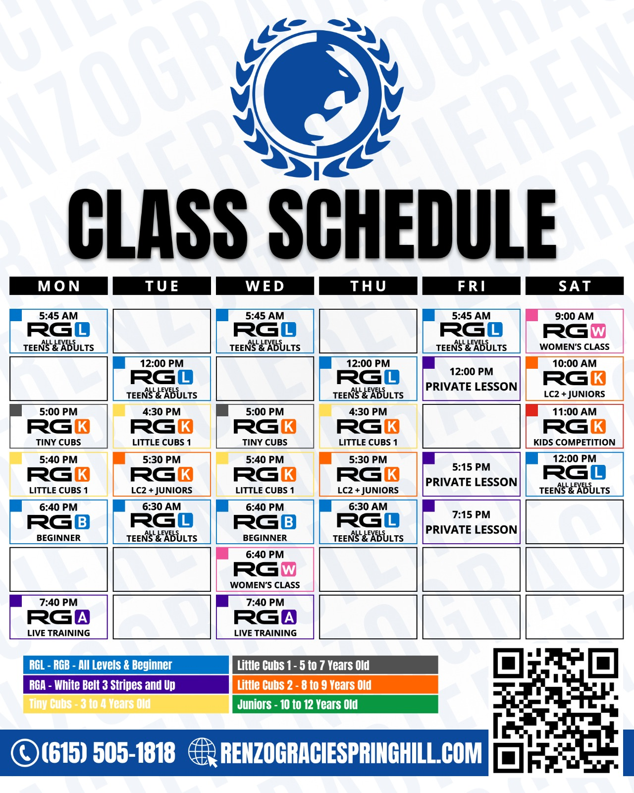 Our schedule is designed to offer flexibility and consistency, making it easy for students to train at times that fit their routine. With classes available throughout the week for beginners, advanced students, and kids, everyone has the opportunity to stay engaged and progress at their own pace. Each session is structured to maximize learning and provide a balanced mix of technique, practice, and conditioning.